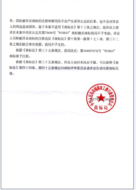 濟(jì)寧商標(biāo),濟(jì)寧市福瑞德機(jī)械有限公司委托濟(jì)寧雨辰知識產(chǎn)權(quán)代理有限公司對福特汽車公司的異議答辯最后商標(biāo)局的裁定是:第“16400767A”號“FURD”商標(biāo)準(zhǔn)予注冊的決定